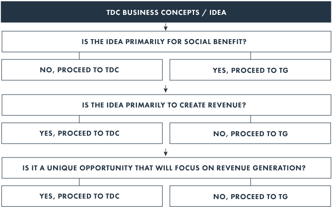The image below represents a summary of considerations for individuals, organizations, and strategic partners wishing to advance a potential business venture/by with the TDC.